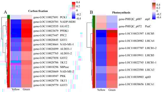 DEGs involved in carbon fixation and photosynthesis. (A) Carbon-fixation-related DEGs. (B) Photosynthesis-related DEGs. The expression level was quantified from three biological replicates in the yellow and green regions, and the color bar indicates an increasing expression level from blue to red.