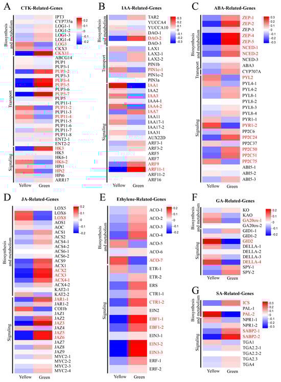 DEGs involved in plant hormone signaling pathways. The red text indicates the differentially expressed genes. (A) Cytokinin (CTK) (B) Auxin (AUX). (C) Abscisic acid (ABA). (D) Jasmonic acid (JA). (E) Ethylene. (F) Gibberellins (GA). (G) Salicylic acid (SA).