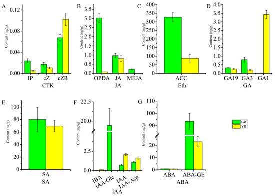 Plant hormones play a crucial role in plant growth, development, metabolism, and responses to biotic and abiotic stresses [,,]. To elucidate the expression patterns of plant-hormone-related genes in the green and yellow tissues of leaves, we identified a total of 202 hormone-related genes and 54 DEGs via comparison with the KEGG database. The cytokinin (CTK) and indole-3-acetic acid (IAA) pathways comprise 11 (5 upregulated, 6 downregulated) and 8 (4 upregulated, 4 downregulated) DEGs, respectively, with a predominant distribution in the transport and signaling components (Figure 6A,B). Twelve DEGs were identified in the abscisic acid (ABA) pathway, with the expression level of three genes upregulated and nine genes downregulated (Figure 6C). Eight DEGs were detected in jasmonic acid (JA)-related genes, of which only one lipoxygenase gene (LOX, gene-LOC110033226) was upregulated in the YR (Figure 6D). Similarly, we also identified only one 1-aminocyclopropane carboxylate oxidase (ACO, gene-LOC110035000) gene that was upregulated in the yellow parts among six ethylene-related DEGs (Figure 6E). A total of three DEGs (gene-LOC110031087, gene-LOC110026193, gene-LOC110034092) involved in the gibberellin (GA) pathway were identified, all of which were upregulated in the YR (Figure 6F). Additionally, one upregulated gene (gene-LOC110031047) and three downregulated genes (gene-LOC110033060, gene-LOC110024985, gene-LOC110025063) were isolated in the salicylic acid (SA) pathway of the YR (Figure 6G). Additionally, the actual concentrations of these hormones were consistent with the expression trends of the related genes (Figure 7).