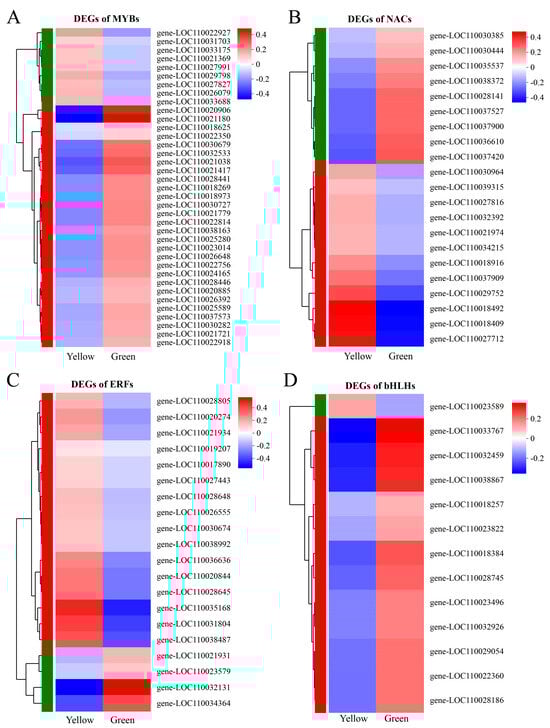 Transcription factors (TFs) serve as crucial regulators by modulating the spatial and temporal expression of target genes through the activation or repression of their transcriptional activity, significantly influencing various plant biological processes. In this study, we annotated a total of 1201 TFs via comparison with the PlantTFDB database, of which 235 were identified as DEGs. We analyzed MYB, ERF, NAC, and bHLH TFs because they were reported to be involved in chlorophyll metabolism and leaf yellowing [,,,] (Figure 8). Among them, MYB TFs were the most highly represented DEG TFs, with a total of 37 annotated (9 upregulated and 28 downregulated) (Figure 8A). In total, 12 of the 21 DEGs in the NAC family were upregulated in the YR (Figure 8B). Additionally, the DEGs within the ERF and bHLH families exhibited contrasting expression profiles. Specifically, a majority of the DEGs in the ERF family showed upregulation (16 out of 20), whereas most genes in the bHLH family were downregulated (12 out of 13) in the YR. (Figure 8C,D).