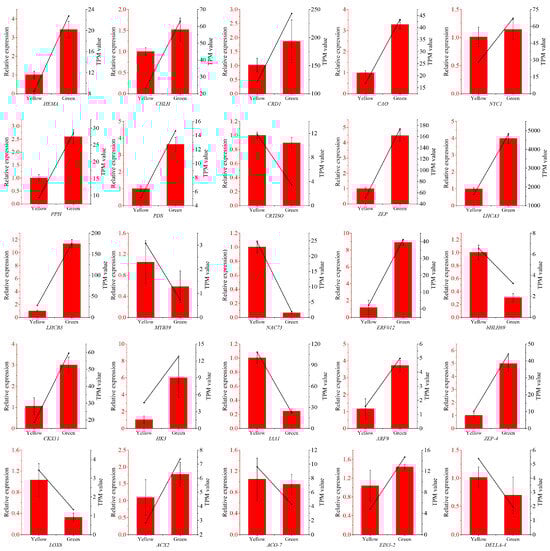 Real-time quantitative PCR (qRT-PCR) validation of the expression of 25 DEGs. The selected DEGs were involved in chlorophyll metabolism (HEMA, CHLH, CRD1, CAO, NYC1, PPH), carotenoid biosynthesis (PDS, CRTISO, ZEP), antenna proteins (LHCA4, LHCB3), TFs (MYB59, NAC73, ERF012, bHLH93, bHLH69), and plant hormones (CKX11, HK3, IAA1, ARF9, ZEP-4, LOX8, ACX2, ACO-7, EIN3-2, DELLA-4).
