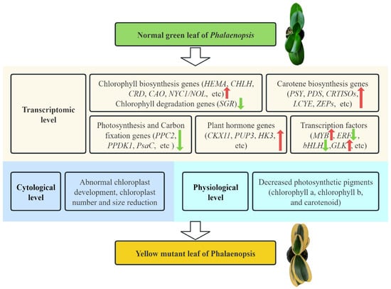 In conclusion, this study explored the mechanisms behind the leaf-color variation in Phalaenopsis Chia E Yenlin Variegata through a comparative analysis between the green region (GR) and yellow region (YR) within the same plant at the cytological, physiological, and transcriptomic level. We observed a significant reduction in chlorophyll content and abnormalities in the chloroplast ultrastructure in the YR, suggesting a partial inhibition of chlorophyll biosynthesis and chloroplast development. Transcriptional sequence analysis identified a total of 3793 DEGs with 1769 upregulated and 2024 downregulated genes. Furthermore, the pathways related to chlorophyll and carotenoid metabolism, photosynthesis and carbon fixation, and plant hormone and transcription factors were analyzed, and changes in the expression of genes involved in these pathways might be responsible for the variegation in leaf color (Figure 10). Our findings offer valuable insights for further investigation into the functional roles of genes associated with leaf yellowing and for facilitating the breeding of new Phalaenopsis varieties with enhanced horticultural value.