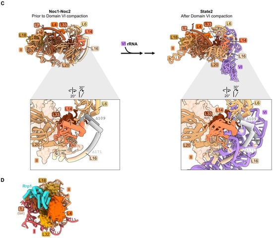 Domain II: (A) Structure of node 1 containing RPs L4, L7, L18, and L32 (left), and of node 2 containing RPs L6, L14, L16, L20, and L33 (right) (PDB: 4V88). Domain VI (purple) is shown docked onto domain II rRNA. The bottom panel depicts the contact points of each protein with the rRNA; (B) a molecular switch between the co-transcriptional Noc1-Noc2 particle and the State 2 intermediate (PDB: 8E5T, 6C0F) [20,26]. State A (lower resolution) precedes State 2 and is not shown; (C) docking of domain VI rRNA onto domain II rRNA during the transition from the co-transcriptional Noc1-Noc2 particle to the State 2 intermediate. Panels below show extensions of L14 and L16 binding to domain VI after compaction. Truncations of L14 and L16 C-termini (grey) result in lethality (PDB: 8E5T, 6C0F); (D) binding of AF Rrp1 to node 1 domain II RPs (PDB: 8E5T).