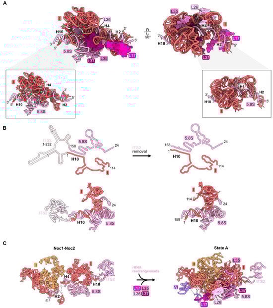 Proximal stem (RPs L17, L26, L35, and L37): (A) The structure of the mature proximal stem RNP (PDB: 4V88); (B) processing of the ITS2 spacer rRNA to create the mature proximal stem (PDB: 6C0F, 4V88); (C) Maturation of the proximal stem during the transition from the Noc1-Noc2 particle to the State A intermediate (PDB: 8E5T, 6EM3) [18,26]; (D) a molecular switch resulting in the replacement of AF Noc1 with RP L17 and AF Noc2 with L26, Nsa1, and Rpf1 during the transition from Noc1-Noc2 to State 2 (PDB: 8E5T, 6C0F).