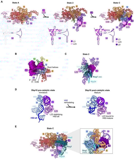 Domain VI (RPs L3, L9, and L23): (A) The sequential assembly of domain VI from State A to State C intermediates (PDB: 6EM3, 6C0F, 6EM1). Bottom panel: secondary structure diagrams indicating the successive stabilization of domain VI rRNA, including contacts with the domain VI RPs; (B) L3 contacts all six root helices, and is proximal to the 5′ end of 5.8S rRNA and the 3′ end of 25S rRNA in the mature LSU (PDB: 4V88); (C) the assembly of AFs Nog1, Rlp24, and Tif6 proximal to L23 is most affected by depletion of L23 (PDB: 6C0F); (D) the assembly of AFs Nug1, Nsa2, and Dbp10 adjacent to L9 is most affected by its depletion (PDB: 6EM1). Note that Dbp10 is invisible in these particles; (E) L23 stabilizes both conformations of H92 (H92-alt, then H92 in its mature form) (PDB: 8V83, 8V87) [23].