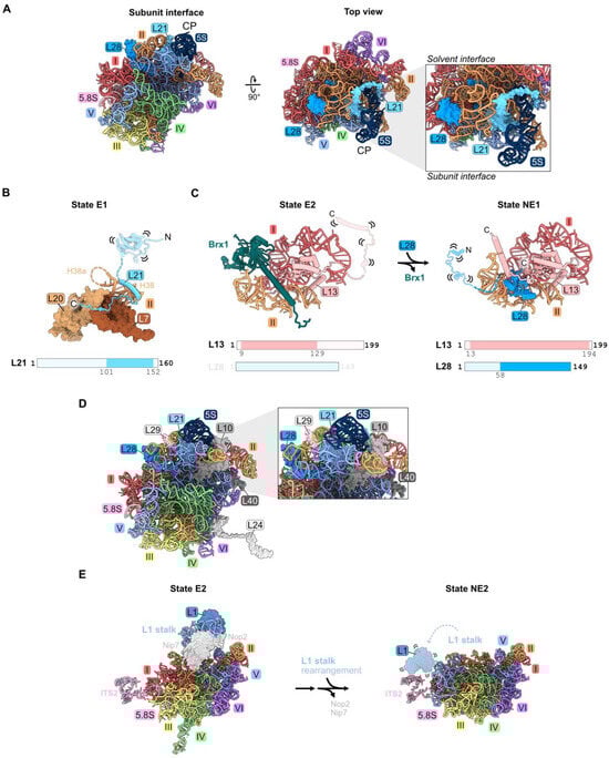 Domain V (RPs L1, L21, and L28): (A) The location of L21 and L28 in domain V beneath the central protuberance (CP) in the mature LSU. Note that L1 is not resolved in this structure (PDB: 4V88); (B) the C-terminal domain of L21 is stabilized on domain II RPs in State E1 (PDB: 7R7A); (C) a molecular switch: the exit of Brx1 enables the entry of the C-terminal globular domain of L28 (7NAC, 7U0H); (D) the assembly of L10, L24, L29, and L40 during nucleoplasmic and cytoplasmic stages of LSU construction is most affected by the absence of L21 or L28 (PDB: 4V88); (E) the rotation of the L1 stalk during the transition of the state E1 intermediate to state NE2. Note that L1 and H77-78 are not resolved following L1 stalk rotation in the nucleus. L1 and H77-78 are overlayed onto the NE2 structure (PDB: 7NAC, 6YLY).