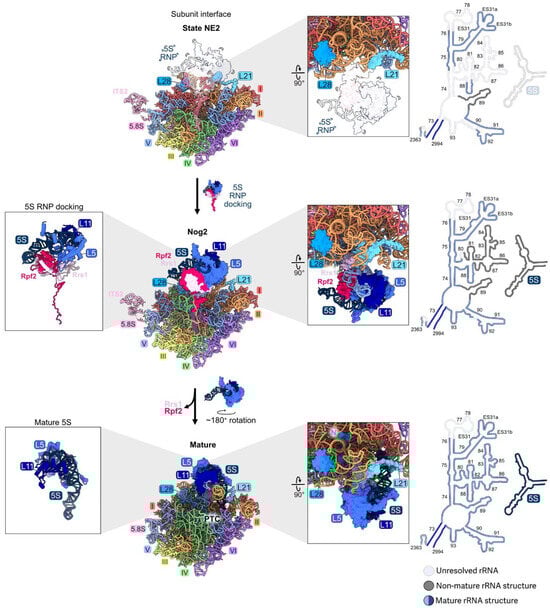 - Lau, B.; Huang, Z.; Kellner, N.; Niu, S.; Berninghausen, O.; Beckmann, R.; Hurt, E.; Cheng, J. Mechanism of 5S RNP Recruitment and Helicase-surveilled rRNA Maturation during pre-60S Biogenesis. EMBO Rep. 2023, 24, e56910. [Google Scholar] [CrossRef]