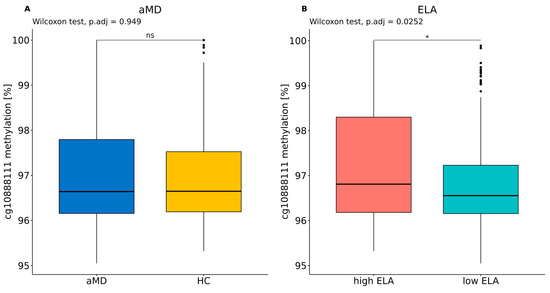 Cg10888111 methylation levels in the context of (A) aMD and (B) ELA. Wilcoxon rank sum tests and the Benjamini–Hochberg correction were applied (ntests = 2). * p.adj. < 0.05. ns: not significant.