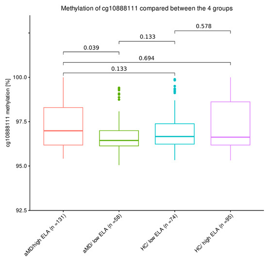 A comparison of the median DNA methylation levels of cg10888111 did not reveal any significant difference between aMD (median ± IQR: 96.6% ± 1.64%) and HC (96.6% ± 1.33%, as shown in Figure 2A; n = 358, W = 16,034, p = 0.949). However, individuals with high levels of ELA (96.8% ± 2.12%) were significantly hypermethylated compared to individuals who experienced less or no ELA (96.6% ± 1.07%, n = 358, W = 13,265, p.adj. = 0.025; Figure 2B).
