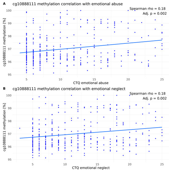Spearman’ correlation of cg10888111 methylation levels within the overall cohort with (A) emotional abuse and (B) emotional neglect. The Benjamini–Hochberg correction was applied (ntests = 5).