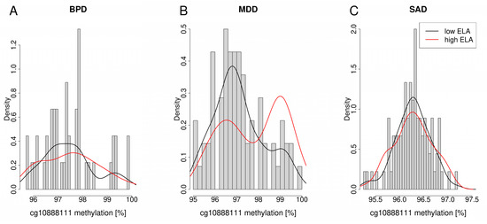 Histograms depicting the cg10888111 methylation levels between high ELA and low ELA in the (A) BPD, (B) MDD and (C) SAD cohorts.
