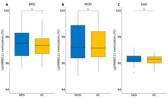 Cg10888111 methylation levels in the context of the respective disorder vs. healthy control individuals in the (A) BPD, (B) MDD and (C) SAD cohorts. Wilcoxon rank sum tests and the Benjamini–Hochberg correction were applied (ntests = 3). ns: not significant.