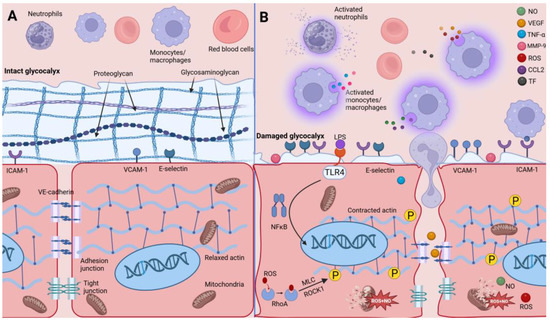Comparison of endothelial cells under physiologic and pathologic conditions. (A) In the physiologic state, blood cells are in a relatively quiescent state. Endothelial cells are in a tightly packed state containing an intact surface glycocalyx, robust intercellular junctions, a relaxed cytoskeleton, and small amounts of adhesion molecules and selectins. (B) In the setting of LPS or sepsis, monocytes, macrophages, and neutrophils produce a large number of signaling molecules, including NO, VEGF, TNF-α, MMP-9, ROS, TF, and CCL-2. These molecules lead to structural and functional alterations in endothelial cells, including degradation of the glycocalyx, increased exposure to and expression of adhesion molecules and selectins, rupture of intercellular connections, and cytoskeleton shrinkage by phosphorylation, and apoptosis due to mitochondrial disruption. Neutrophils cross the endothelial cell barrier through an enlarged paracellular gap. These changes ultimately cause an increase in the adhesion and permeability of the endothelium.