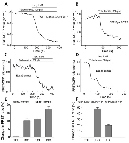 FRET measurements of Epac-based biosensor activation in living cells. HEK293a cells were transiently transfected with different cAMP sensors and treated with Tolbutamide (TOL) and Isoprenaline (ISO) as a control. CFP-(Epac1,δDEP)-YFP biosensor is not activated by TOL and responds only to increased cAMP after adding ISO as a positive control (A). Decrease in the FRET/CFP ratio reflects an increasing cAMP concentration or a similar conformational change in the biosensor construct. In cells expressing CFP-Epac2-YFP (B) but not Epac2-camps (C), treatment with TOL alone already leads to a change in FRET, suggesting that this SU drug induces a conformational change in the full-length Epac2-based CFP-Epac2-YFP biosensor. Surprisingly, Epac1-camps can also be rapidly activated by TOL (D). Representative curves (A–D) are from 4 to 6 independent experiments with multiple measured cells each (5–10). Data analysis (E,F) shows means ± SE from the following number of independent experiments, n = 5 for a: TOL 48.2 ± 2.3%; n = 5 for b: TOL 20.1 ± 1.5%; n = 6 for c: TOL 0.4 ± 0.3%; and n = 6 for d: TOL 11.1 ± 1.6%.