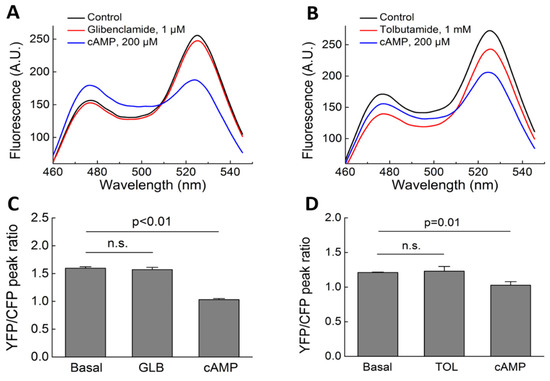 FRET measurements of Epac2-camps biosensor activation in vitro. Representative fluorescence emission spectra (n = 4) of the sensor recorded upon 436 nm excitation before and after adding Glibenclamide (A) or Tolbutamide (B). Decrease in the right acceptor peak fluorescence with a concomitant increase in the left donor peak fluorescence is indicative of a decrease in the FRET ratio, which reflects increasing cAMP concentration or a similar conformational change in the biosensor construct. There is a slight overall decrease in fluorescence intensity due to a slight dilution for both emission peaks, but no significant changes in FRET for both SU drugs (data analysis is in C,D). Mean values ± SE for measured YFP/CFP FRET ratios were for A: basal 1.60 ± 0.03 and after GLB 1.57 ± 0.04 (n.s., p = 0.35) and for B: basal 1.21 ± 0.01 and after TOL 1.27 ± 0.07 (n.s., p = 0.79). Subsequent stimulation with cAMP led to a dramatic decrease in FRET (blue curve) and served as a positive control. n.s., not significant by one-way ANOVA, followed by Sidak’s multiple comparison test.