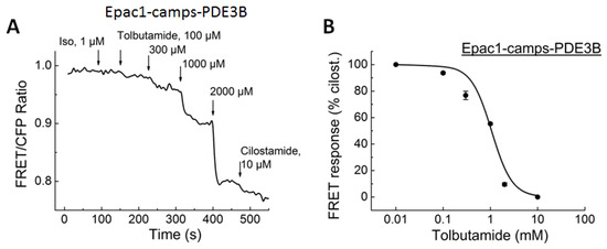 FRET measurements of TOL-induced PDE3B inhibition in cells expressing Epac1-camps/PDE3B fusion biosensor. HEK293a cells were transiently transfected with the biosensor and treated with increasing concentrations of TOL followed by the full inhibition of this PDE using 10 µM cilostamide. (A) Representative FRET tracing and (B) data analysis (n = 4). Decrease in the FRET ratio is indicative of direct PDE inhibition by tolbutamide, reported in real time by these biosensor constructs.