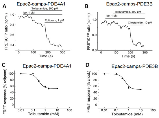 FRET measurements of TOL-induced PDE3B and PDE4A1 inhibition in cells expressing Epac2-camps/PDE fusion biosensors. HEK293a cells were transiently transfected with the respective biosensors and treated with increasing concentrations of TOL followed by the full inhibition of PDE3 using 10 µM cilostamide or PDE4 using 10 µM rolipram. (A,B) Representative FRET traces and (C,D) concentration–response dependence of the TOL effect on PDE3B and PDE4A (n = 6 independent experiments for c and n = 4 for d). Decrease in the FRET ratio is indicative of direct PDE inhibition by tolbutamide, reported in real time by these biosensor constructs.