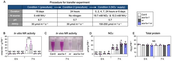 We manipulated the activities of nitrate reduction and AOX via the transfer experiment (Figure 1A) using Col-0 and mutants deficient in either or both NR and AOX activities. First, plants were grown for 18 days with ammonium as the sole N source (Condition 1 in Figure 1A) to ensure uniform growth independent of NR activity. Higher medium pH and lower light intensity were used to reduce ammonium toxicity and AOX expression [,,,], allowing uniform growth regardless of AOX activity. Second, plants were subjected to N starvation at pH 5.7 for 24 h (Condition 2) to induce AOX expression [,]. Finally, plants were transferred to a medium containing adequate nitrate and incubated under moderate light intensity (Condition 3), which induced NR expression and filled photosynthetically-derived reductants to the cell [,,]. The NR activity of Col-0 increased rapidly from 0 to 7 h after nitrate supply and slightly more from 7 to 24 h (Figure S1A). Both in vitro and in vivo NR activities were increased 7 h after nitrate supply in the shoots of Col-0 and aox1a-1 but not in nr and aox1a-1 nr (Figure 1B,C). Thus, we focused on the 7 h after nitrate supply to identify the early effects of nitrate reduction for subsequent experiments. We found that nitrate accumulated in the shoots of all lines after nitrate supply, with concentrations ranging from 12.1 to 22.4 µmol g−1 (Figure 1D), indicating an adequate supply of nitrate for signaling. Indeed, the expression of NIA2 encoding the major NR isoform in leaves [], which is inducible by nitrate signal [,], was strongly induced 7 h after nitrate supply in Col-0 and aox1a-1 but not in nr and aox1a-1 nr (Figure S1B). Higher nitrate concentrations in shoots of nr and aox1a-1 nr than Col-0 and aox1a-1 would reflect a deficiency in nitrate reduction (Figure 1D). Shoot protein concentrations were comparable among all lines before and after nitrate supply, ranging from 27.0 to 29.7 mg g−1 (Figure 1E), suggesting that no N starvation occurred. RT-qPCR and Western blot analyses confirmed that the signals corresponding to AOX1a and AOX were negligible in aox1a-1 and aox1a-1 nr (Figure S1C,D), suggesting that the knockout of AOX1a was sufficient to diminish AOX, as reported earlier [,,]. Taken together, these culturing conditions permit comparisons of plants’ differing nitrate reduction and AOX activity without causing ammonium toxicity, N starvation, and lack of nitrate signaling.