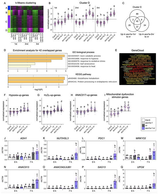 Transcriptomic alteration by AOX1a deficiency under limited nitrate reduction conditions. (A–I) Shoots from plants 7 h after nitrate supply were subjected to RNA-seq. One plant from each line (six in total) per plate was grown. Six shoots were pooled as one biological replicate. (A) Heat map from a k-means clustering of normalized transcript levels. Magenta and green represent higher and lower expression levels, respectively. Numbers (1st, 2nd, 3rd) indicate the order of independent RNA-seq experiments. (B) Plots of normalized transcript levels in cluster D. Normalized transcript levels of splice variants were averaged for each gene. (C) Venn diagram showing the number of genes from cluster D and genes significantly upregulated in aox1a-1 nr or aox1a-2 nr relative to nr. Enriched terms identified by Metascape (D) and GeneCloud (E) from the 42 overlapped genes in (C). (E) shows the number of genes containing the term (left) and the fold enrichment (right). Shoot expression of genes upregulated under hypoxia (F), by H2O2 (G), by ANAC017 (H), and included in mitochondrial dysfunction stimulon (I) 7h after nitrate supply. (F–I) Normalized transcript levels of splice variants were averaged for each gene using means from three independent experiments. RT-qPCR analysis of marker genes upregulated under hypoxia (J–M) and by oxidative stress (N–Q) in shoots before and 7 h after nitrate supply. (J–Q) Two plants of each line (eight in total) per plate were grown, and four shoots were pooled as one biological replicate. Data: mean ± SD (n = 5).