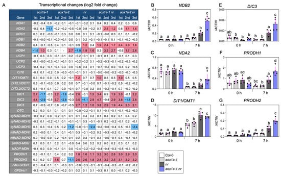 Effects of AOX1a deficiency on gene expression of type II NAD(P)H dehydrogenases, uncoupling proteins, and reductant shuttles under limited nitrate reduction conditions. (A) Transcriptional changes in genes encoding type II NAD(P)H dehydrogenases (NDA1/2, NDC1, NDB1/2/4), uncoupling proteins (UCP1/2/3), and complex I 76-kD subunit (CI76), and genes involved in reductant shuttles (DiT1/OMT1, DiT2.1/DCT1, DiT2.2/DCT2, DIC1/2/3, DTC, cyNAD-MDH1/2/3, mtNAD-MDH1/2, plNAD-MDH, NADP-MDH, PRODH1/2, FAD-GPDH, GPDHc1) in plant shoots 7h after nitrate supply. Transcriptional changes are represented as log2 fold change ratios against Col-0 based on the RPM (reads per million mapped reads) from the RNA-seq. Red and blue represent up- (>2-fold) and downregulation (<0.5 fold), respectively. Relative transcript levels of (B) NDB2, (C) NDA2, (D) DiT1/OMT1, (E) DIC3, (F) PRODH1, and (G) PRODH2 in plant shoots before and 7 h after nitrate supply. Data: mean ± SD (n = 5).