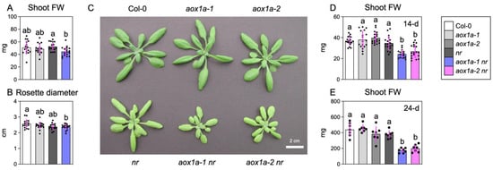 Effects of AOX1a deficiency on shoot growth under limited nitrate reduction conditions. (A) Shoot fresh weight and (B) rosette diameter of plants 6 days after nitrate supply. One plant of each line (four in total) per plate were grown and one shoot was regarded as one biological replicate. (C) Shoot appearance of 24-day-old plants and shoot fresh weights of (D) 14-day-old and (E) 24-day-old plants grown in pots containing nutrient-rich soil. Data: mean ± SD (n = 17 (A,B), n = 18 (D), n = 7 (E)).