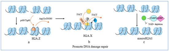 The role of histone H2A variants in DNA damage repair. (a) H2A.Z promotes DNA damage repair by eviting nucleosomes in chromatin with the help of the histone chaperones Anp32e and INO80. (b) γ-H2A.X accelerates DNA damage repair by recruiting DNA damage repair factors. RT refers to repair factors. (c) MacroH2A1 impedes the activity of PARP1 and prevents depletion of NAD+, thereby promoting DNA damage repair.