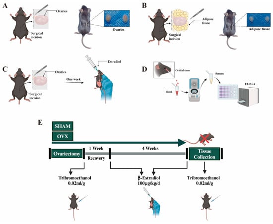 Development of mice experimental models: (A–C) implementation of experimental protocols in mice, involving bilateral oophorectomy (OVX), sham operation as a control (SHAM), and estrogen intervention; (D) procedures for blood sampling and estrogen level quantification using ELISA technique in mice; (E) details of the estrogen intervention protocol, including dosage and duration.