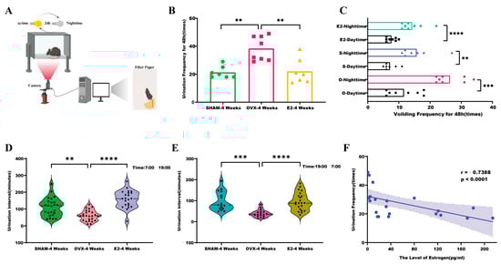 Association of estrogen fluctuations with altered urinary frequency in mice: (A) methodology for assessing urinary behavior in mice; (B) comparative analysis of voiding frequency over 48 h in OVX, SHAM, and E2 groups; (C) assessment of diurnal variations in 48 h urinary frequency among OVX, SHAM, and E2 groups after 4 weeks of model establishment. The number of data points representing the time intervals between adjacent micturition events across three mouse groups; (D,E) investigation of urination intervals (daytime and nighttime) in OVX, SHAM, and E2 groups; (F) correlation analysis between estrogen levels and voiding frequency. R, Pearson correlation coefficient; p-value, two-tailed p-value of the Pearson correlation. Statistical significance denoted as ** p < 0.01; *** p < 0.001; **** p < 0.0001.