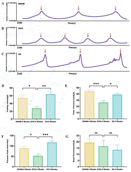 Urodynamic analysis was conducted to evaluate cystometric parameters in three groups of mice, namely SHAM, OVX, and E2: (A–C) cystometry in SHAM, OVX, and E2 group mice recorded changes in intravesical pressure, voiding time, and bladder contractions (arrows); (D–G) comparison of voiding volume, peak pressure, pressure peak interval, and baseline pressure of mice in SHAM, OVX, and E2 groups. Statistical significance denoted as * p < 0.05; ** p < 0.01; *** p < 0.001; ns indicates non-significant.