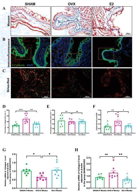 Alterations in bladder histology attributable to estrogen level variations: (A) Masson’s trichrome staining of bladder tissues from OVX, SHAM, and E2 group mice. This technique demarcates muscle fibers in red, collagen fibers in blue, and uroepithelial tissue in pink; (B) Immunofluorescence staining for E-cadherin in bladder tissues of mice in OVX, SHAM, and E2 groups (yellow dotted box); (C) Sirius Red staining applied to bladder tissues of mice in OVX, SHAM, and E2 groups for collagen detection; (D–F) comparative evaluation of the collagen fiber area, smooth muscle area, and the collagen-to-smooth muscle ratio in bladder tissues of each group; (G,H) quantitative analysis of Collagen I and Collagen III in bladder tissues across all groups. Statistical significance denoted as * p < 0.05; ** p < 0.01; *** p < 0.001; ns indicates non-significant.