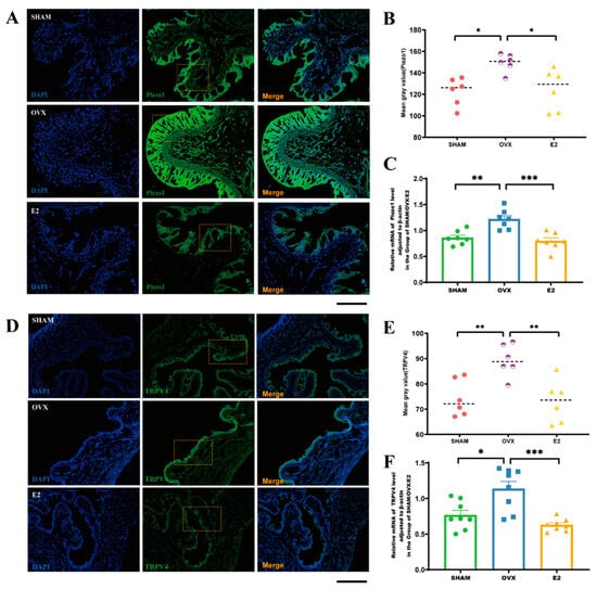 Previous studies have demonstrated that estrogen levels influence the structural composition of mice bladder tissue [9]. Given the potential association between estrogen levels and urothelial channel, the expression and transcription levels of two mechanosensitive channels, Piezo1 and TRPV4, were compared across the three groups in mice bladder tissue. The results demonstrated that bladder tissues from the OVX group showed higher fluorescence intensity and greater expression of the mechanosensitive channel Piezo1 (Figure 5A,B) and TRPV4 (Figure 5D,E) compared to the SHAM and E2 groups (p < 0.05; p < 0.01). Additionally, the OVX group exhibited increased transcriptional levels of Piezo1 and TRPV4 in bladder tissues relative to the SHAM group (p < 0.01; p < 0.05). Conversely, transcript levels of Piezo1 and TRPV4 decreased following estrogen treatment (p < 0.001; p < 0.001) (Figure 5C,F). These results suggest a significant reversed correlation between estrogen levels and the transcript levels of mechanosensitive channels such as Piezo1 and TRPV4.