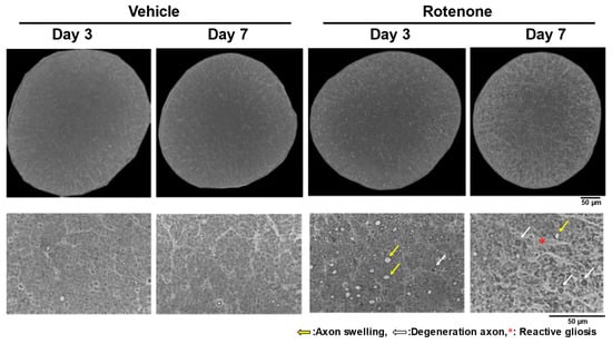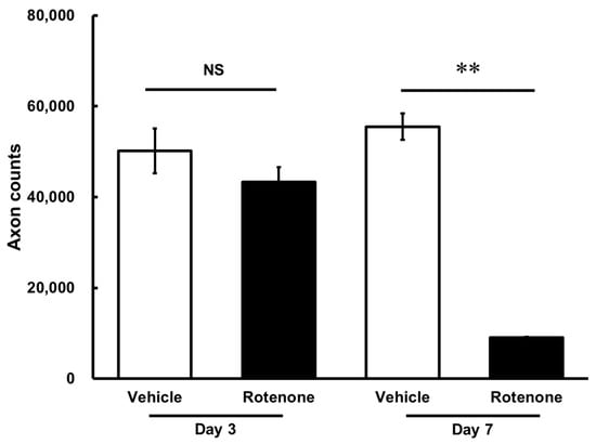The axon counts in the rotenone-treated groups comprised 86.4 ± 6.4% and 16.3 ± 0.3% of each vehicle on day 3 and day 7, respectively (Table 1).