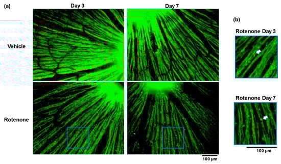 Rotenone caused axonal beading in the axon of RGC on days 3 and 7 (Figure 3). It is not known whether mitochondrial dysfunction is directly associated with axonal beading. The beading of neurites induced by the activated microglia is an early feature of neuronal dysfunction toward neuronal death due to the inhibition of mitochondrial respiration and axonal transport [28]. In this study, reactive gliosis after rotenone injection was observed (Figure 1). Although further research, such as the quantification of gliosis, is needed, mitochondrial dysfunction may be causing the activated microglia-induced axonal beading.