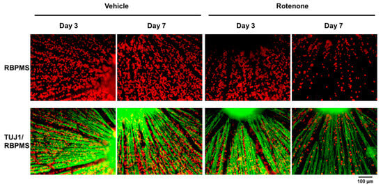 Immunohistochemistry of RGCs by RNA-binding protein with multiple splicing (RBPMS) and TUJ1 antibodies on retinal flatmounts. The double staining of RBPMS (RGC maker) and TUJ1 of RGCs was performed on retinal flatmounts following the rotenone injection on day 3 and day 7. Red represents RBPMS; green represents TUJ1 (20× magnification). The scale bar corresponds to 100 µm.
