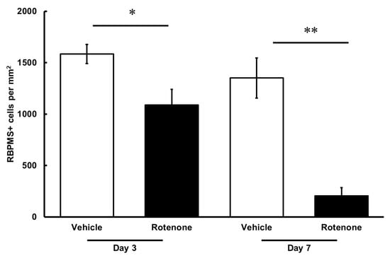 Quantification of RGCs after the rotenone injection. The RBPMS-positive cells were identified using an upright epifluorescence microscope. The CellProfiler software was used for the quantification of RGC numbers. Each value represents the mean ± SEM of 4–5 eyes. Four rats were used. * p < 0.05 and ** p < 0.01, compared to the vehicle (Welch’s t-test).