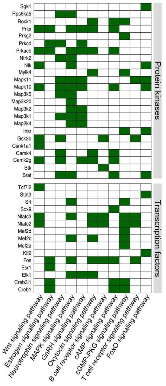 TFs and protein kinases from cellular signaling pathways targeted by miRNAs identified in Table 5. miRNAs differentially expressed in aged NHERF1−/− mouse kidney and their mRNA targets identified from KEGG pathway analysis in Table 5 were plotted by function: Protein Kinases and Transcription Factors. This Figure shows major NHERF1-dependent pathways affected during aging.