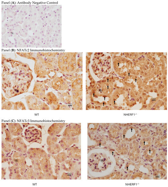 Expression of NFATc2 and NFATc3 in kidneys. Representative image of kidneys from 18–24-month-old WT (left panels) or NHERF1−/− (right panels) mice (n = 6, 3 males and 3 females in each group) analyzed by immunohistochemistry for expression of NFATc2 (panel (B)) and NFATc3 (panel (C)). Panel (A) is a negative control for the antibodies. Arrows show expression staining for NFATc2 (B) and NFATc3 (C) in the nuclei.