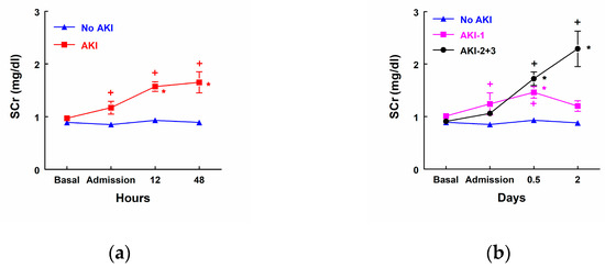 Serum creatinine (SCr) concentration (mg/dL) before surgery, at admission to the intensive care unit (ICU), and 12 h and 48 h after surgery in (a) patients that did not develop AKI (No AKI, n = 25) and patients that developed AKI (n = 19), as well as (b) patients that did not develop AKI (No AKI, n = 25), patients that developed stage 1 AKI (AKI-1, n = 11), and patients that developed stage 2 or 3 AKI (AKI-2 + 3, n = 8). Means ± SEM are displayed. * p < 0.05 vs. patients at their own basal level. + p < 0.05 vs. patients that did not develop AKI.