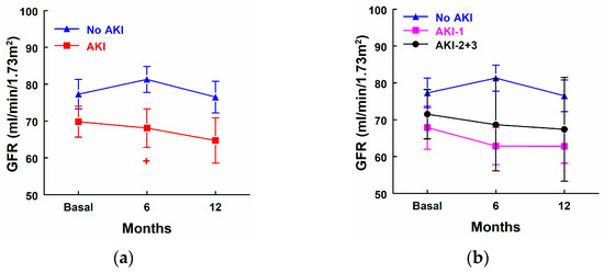 Glomerular filtration rate (GFR) before surgery, 6 months after surgery, and 12 months after surgery in (a) patients that did not develop AKI (n = 23) and patients that developed AKI (n = 12), as well as (b) patients that did not develop AKI (No AKI, n = 23), patients that developed stage 1 AKI (AKI-1, n = 7), and patients that developed stage 2 or 3 AKI (AKI-2 + 3, n = 5). + p < 0.05 vs. patients that did not develop AKI. Means ± SEM are displayed. + p < 0.05 vs. patients that did not develop AKI.