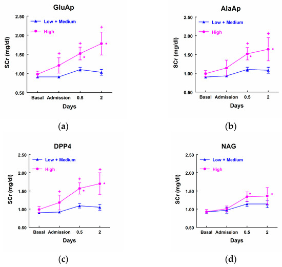 Concentration of SCr (mg/dL) in patients that showed high levels of GluAp (a), AlaAp (b), DPP4 (c), and NAG (d) at admission to the ICU (highest quartile, n = 11) and patients with low or medium levels of these markers (n = 33). Means ± SEM are displayed. * p < 0.05 vs. their own basal level. + p < 0.05 vs. the corresponding Low + Medium cluster.