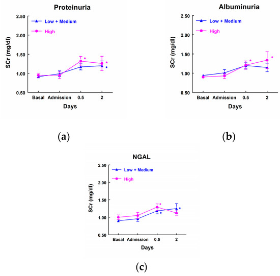 Concentration of SCr (mg/dL) in patients that showed high levels of proteinuria (a), albuminuria (b), and NGAL (c) at admission to the ICU (highest quartile, n = 11) and patients with low or medium levels of these markers (n = 33). Means ± SEM are displayed. * p < 0.05 vs. their own basal level.