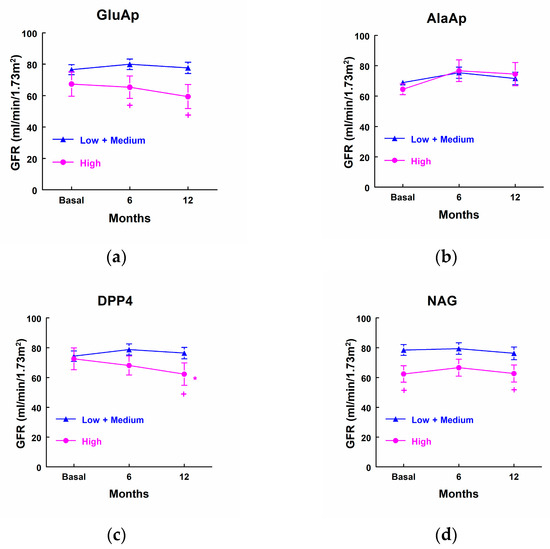 Glomerular filtration rate (mL/min/1.73 m2) in patients that showed high levels of GluAp (a), AlaAp (b), DPP4 (c), and NAG (d) at admission to the ICU (highest quartile, n = 10) and patients with low or medium levels of these markers (n = 25). Means ± SEM are displayed. * p < 0.05 vs. their own basal level. + p < 0.05 vs. the corresponding Low + Medium cluster.