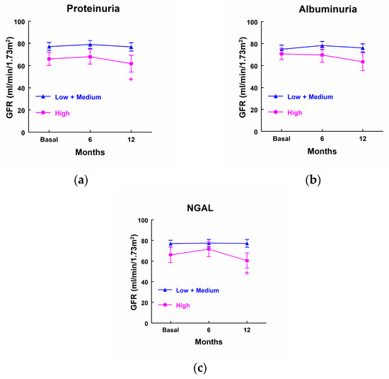 Glomerular filtration rate (mL/min/1.73 m2) in patients that showed high levels of proteinuria (a), albuminuria (b), and NGAL (c) at admission to the ICU (highest quartile, n = 10) and patients with low or medium levels of these markers (n = 25). Means ± SEM are displayed. + p < 0.05 vs. the corresponding Low + Medium cluster.