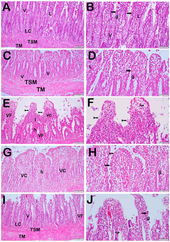 Figure 2. Representative Light Microscopic Screen Image of H&E-Stained Intestinal Tissue Sections. Tunica Submucosa (TSM), Tunica Muscularis (TM), Lamina Propria (L), Lieberkühn Crypts (LC), Goblet Cells (G), Enterocytes (arrow). (A(×20),B(×40)) Control Group: Normally structured epithelium consisting of enterocytes (arrow) and goblet cells (g) is observed. In addition, normally structured tunica submucosa (tsm) and tunica muscularis (tm) layers are observed (IHDS 1 (0–1)). (C(×20),D(×40)) O3 Group: The tunica mucosa layer consisting of enterocytes and goblet cells with a typical structure is observed (IHDS 1 (1–2)). (E(×20),F(×40)) I/R Group: Diffuse necrosis (tailed arrow) and villus fusions (vf) are observed in intestinal epithelial cells. In addition, Gruenhagens space extension (spiral arrow), vascular congestion (vc), hemorrhage (h), and widespread inflammations (I) in the lamina propria are observed (IHDS 9 (9–11)). (G(×20),H(×40)) I/R + TMZ Group: A decrease in necrotic enterocytes and villus fusions is observed. In addition, a reduction in hemorrhage, vascular congestion, and inflammation is observed (IHDS 4 (4–5.5)). (I(×20),J(×40)) I/R + O3 Group: In addition to the decrease in the number of necrotic enterocytes in intestinal epithelial cells, enterocytes with a widespread typical structure are observed. It is observed that there is a decrease in villus fusions, vascular congestion, and hemorrhage areas. In addition, it is observed that the infiltrative areas in the lamina propria have decreased (IHDS 1 (0–1)).