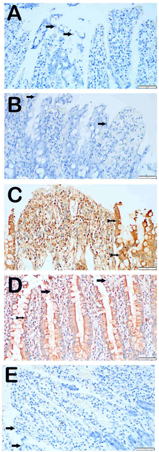 Figure 4. Representative Light Microscopic Screen Images of Intestinal Tissue Sections Incubated with GRP-78 Primary Antibody. (A(×40)) Control Group: Enterocytes with normal structure are observed to be immune-negative (arrow, GRP-78 positivity score: 0 (0–0.5)). (B(×40)) O3 Group: Enterocytes with typical structure are observed to be immuno-negative for GRP-78 primary antibody (arrow, GRP-78 positivity score: 0 (0–1)). (C(×40)) I/R Group: It is observed that the number of cells showing positivity for intense GRP-78 primary antibody has increased (tailed arrow, GRP-78 positivity score: 2 (1–2)). (D(×40)) I/R + TMZ Group: It is observed that the number of cells showing positivity for intense GRP-78 primary antibody has decreased (tailed arrow, GRP-78 positivity score: 1 (0–1)). (E(×40)) I/R + O3 Group: It is observed that the number of enterocytes showing positivity for GRP-78 primary antibody has decreased, but enterocytes with typical structure are commonly observed (arrow, GRP-78 positivity score: 0 (0–1)).