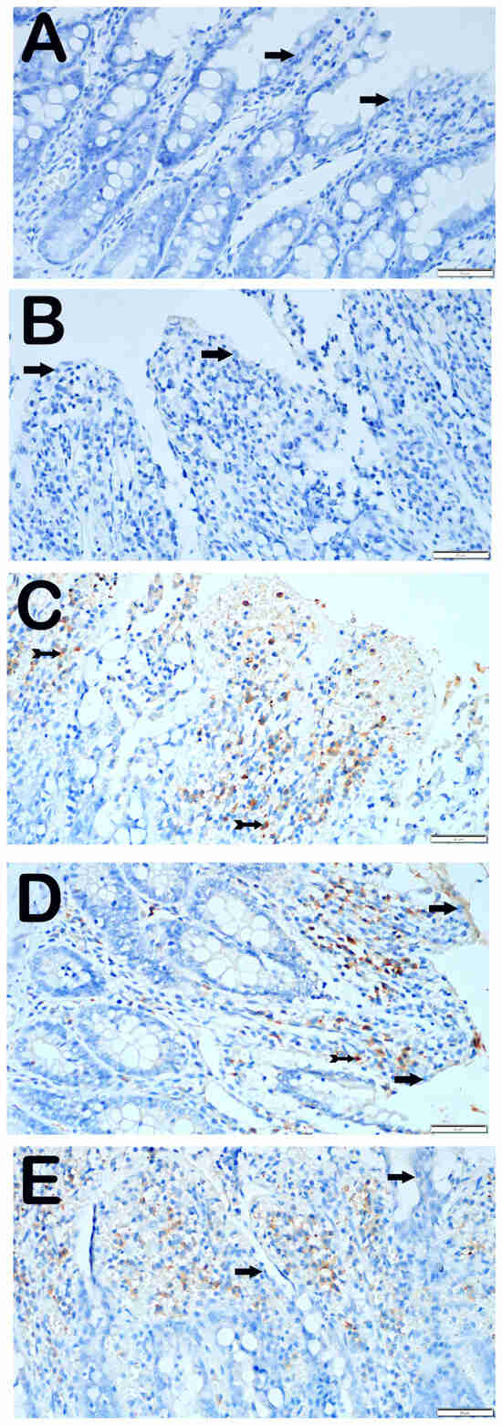 Figure 3. Representative Light Microscopic Screen Images of Intestinal Tissue Sections Incubated with CHOP Primary Antibody. (A(×40)) Control Group: It is observed that enterocytes with normal structure are immune-negative in terms of CHOP primary antibody (arrow, CHOP positivity score: 0 (0–0)). (B(×40)) O3 Group: Enterocytes with typical structure are observed to be immune-negative (arrow, CHOP positivity score: 0 (0–0)). (C(×40)) I/R Group: It is observed that the number of cells showing intense CHOP primary antibody positivity has increased (tailed arrow, CHOP positivity score: 2 (2–3)). (D(×40)) I/R + TMZ Group: It is observed that the number of cells showing positivity for intense CHOP primary antibody has decreased (tailed arrow, CHOP positivity score: 0.5 (0–1)). (E(×40)) I/R + O3 Group: Although the number of enterocytes showing positivity for the CHOP primary antibody has decreased, enterocytes with typical structures are commonly observed (arrow, CHOP positivity score: 0 (0–1)).