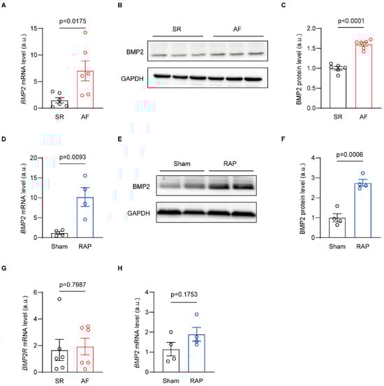 BMP2 expression increased in the atria of different AF models. (A) qRT-PCR-tested BMP2 mRNA level in SR and AF patient atria, n = 6/group. (B,C) Western blot tested BMP2 protein level in SR and AF patient atrial samples, n = 6/group. (D) qRT-PCR-tested BMP2 mRNA level in sham and RAP atria, n = 4/group. (E,F) Western blot-tested BMP2 protein level in sham and RAP rabbit atria, n = 4/group. (G) BMP2 receptor mRNA level in SR and AF patient atria, n = 6/group. (H) qRT-PCR-tested BMP2 receptor mRNA level in sham and RAP rabbit atrial tissues, n = 4/group. SR, sinus rhythm; AF, atrial fibrillation; RAP, right atria tachypacing. The bar graph data are mean ± SEM with individual values. p-values are determined with unpaired Student’s t-test in (A,C,D,F,G,H).
