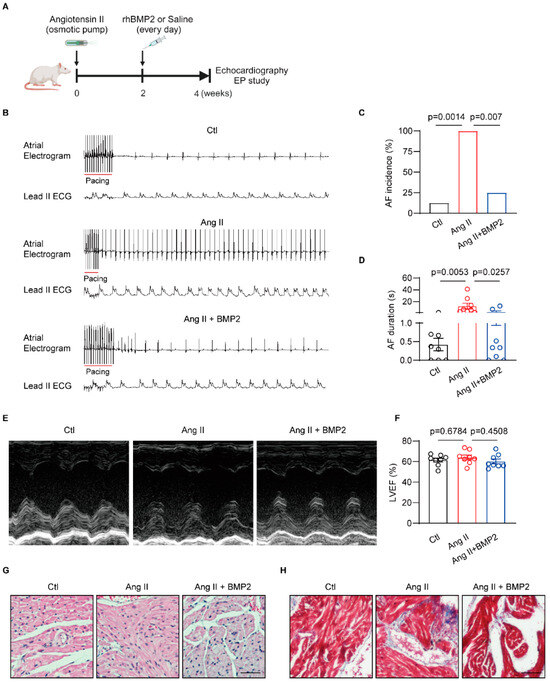 BMP2 alleviated Ang-II induced AF incidence and atrial fibrosis in rats. (A) The scheme of Ang II and recombinant human BMP2 treatment in rats, n = 8/group. (B) The representative surface ECG and atrial electrogram of Ctl, Ang II and Ang II + BMP2 rats. (C,D) The AF incidence and AF duration in Ctl, Ang II and Ang II + BMP2 rats, n = 8/group. (E) Representative LV M-mode echocardiograph images. (F) The measurement of left ventricular ejection fraction in Ctl, Ang II and Ang II + BMP2 rats, n = 8/group. (G) Representative HE staining images of the three groups of rat atria, n = 3/group. Scale bar: 100 μm. (H) Representative Masson staining images of in three groups of rats, n = 3/group. Scale bar: 100 μm. Ctl, control; angiotensin II, Ang II; LVEF, left ventricle ejection fraction; AF, atrial fibrillation. The bar graph data are mean ± SEM with individual values. p-values are determined with one-way ANOVA and Turkey’s multiple comparisons test in (F), Fisher’s exact test in (C), and Mann–Whitney test in (D).