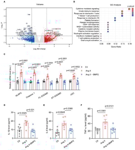 RNA-sequence identify the negative role of BMP2 in rat atrial inflammation. (A) The volcano plot to present the differential genes in Ang II and Ang II + BMP2 rat atria, n = 3/group. (B) GO analysis showing potential function of the related differential genes. (C) qRT-PCR assay verified the mRNA levels of NLRP3, Caspase 1, FL-GSDMD, NT-GSDMD, and ASC in three groups of rat atria, n = 6/group. (D–F) Elisa test showing the serum levels of IL-1β, IL-6, and TNF-α in sham, Ang II and Ang II + BMP2 rats, n = 6/group. Ctl, control; angiotensin II, Ang II. The bar graph data are mean ± SEM with individual values. p-values are determined with one-way ANOVA and Turkey’s multiple comparisons test in (C–F).