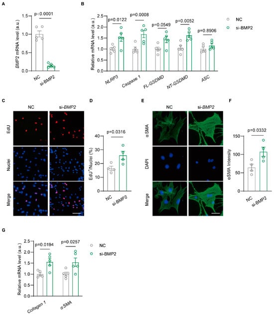 Knockdown BMP2 enhances NLRP3 inflammasome pathway in rat atrial fibroblasts. (A) qRT-PCR assay showed BMP2 mRNA levels in NC and si-BMP2 rat atrial fibroblasts, n = 5/group. (B) qRT-PCR results verified the mRNA levels of NLRP3, Caspase 1, FL-SDMD, NT-GSDMD and ASC in NC and si-BMP2 ACFs, n = 5/group. (C,D) EdU testing the proliferation of NC and si-BMP2 ACFs, n = 4/group. Scale bar: 50 μm. (E,F) αSMA staining in NC and si-BMP2 ACFs, n = 4/group. Scale bar: 25 μm. (G) qRT-PCR results verified mRNA levels of Collagen1 and αSMA in NC and si-BMP2 ACFs, n = 5/group. Negative control, NC and knockdown BMP2, si-BMP2. The bar graph data are mean ± SEM with individual values. p-values are determined with unpaired Student’s t-test in (A,B,D,F,G).